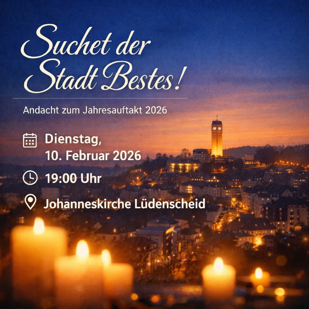 ✨ "Suchet der Stadt Bestes!" ✨ Zum Jahresauftakt laden wir zu einer gemeinsamen Andacht ein. Zeit zum Innehalten, Kraft sammeln und den Blick neu auf das richten, was unser Handeln trägt: Verantwortung, Gemeinsinn und das Wohl unserer Stadt. 📅 Dienstag, 10. Februar 2026 | 19:00 Uhr 📍 Johanneskirche Lüdenscheid Eingeladen sind alle, die sich in Kirche, Politik, Vereinen oder ganz persönlich für unsere Stadt engagieren ? und alle Interessierten. Im Anschluss besteht die Möglichkeit zum offenen Austausch. 🤍 Gemeinsam innehalten. 🏙️ Gemeinsam Verantwortung tragen. 🙏 Gemeinsam der Stadt Bestes suchen. #SuchetDerStadtBestes #CDULüdenscheid #Andacht #Jahresauftakt #Gemeinschaft Verantwortung